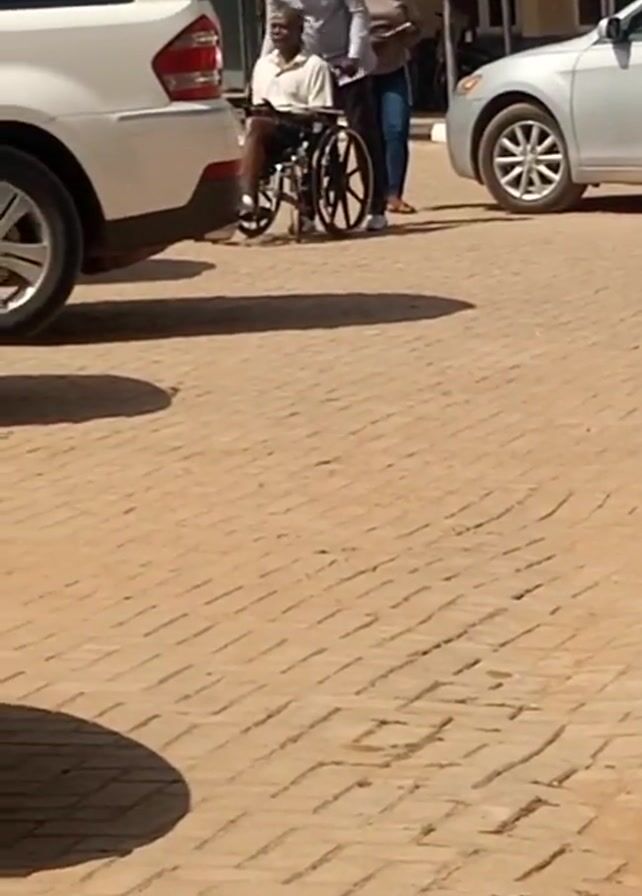 The scene shows an elderly man in a wheelchair being assisted by a younger man, presumably a caregiver, on a brick-paved area