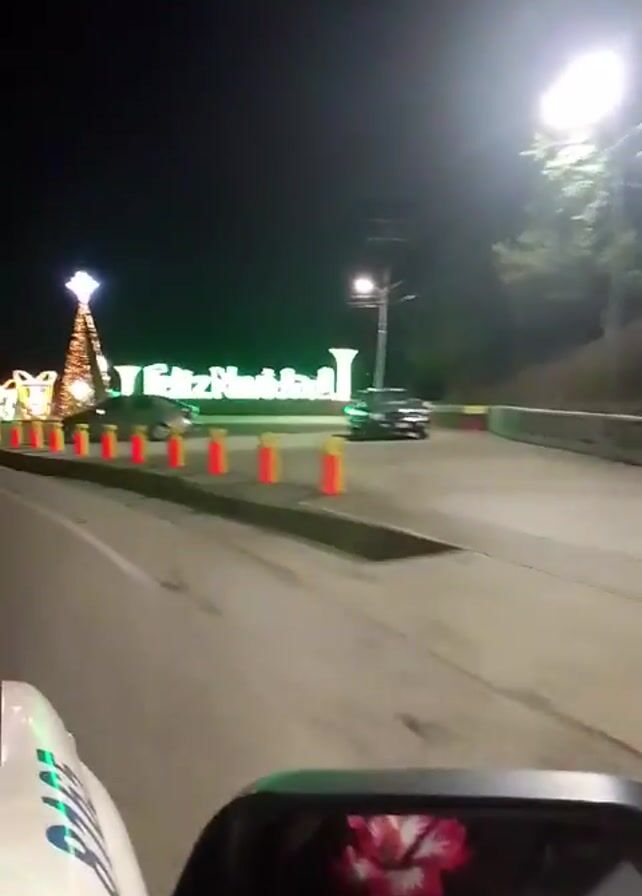 A night-time drive reveals Christmas decorations lining a road. "Feliz Navidad" in bright green lights is displayed along with a decorated Christmas tree and presents lit up in white. The road is lined with orange and yellow bollards. A car passes by in the background. The camera is pointed from within a vehicle, with the side mirror visible.