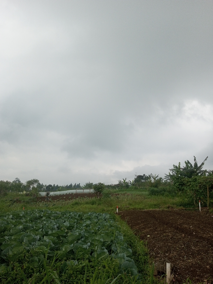 Under a cloudy sky, a field displays two sections. The left side features dense, leafy green cabbages growing amidst tall weeds. To the right, bare, dark-brown soil indicates recently cultivated or fallow land. In the background, greenery blends with trees. A faint, translucent greenhouse-like structure sits further back in the field. White and red posts mark the boundaries between the cultivated areas.