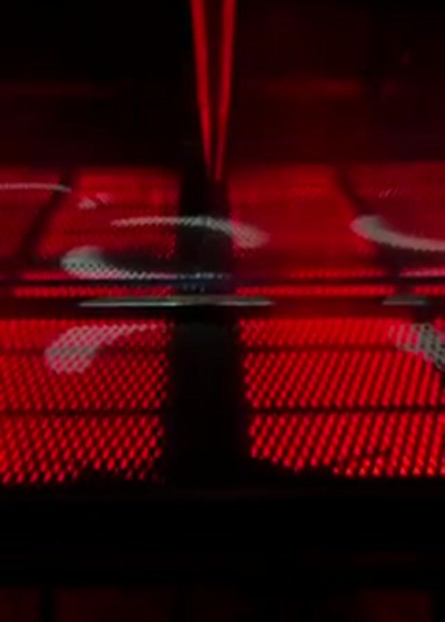 mannequin in the center of a dance floor, revealed by two lights that converge on it from above. The dance floor has a patterned, red grid of lights. In the background are also red lights. The mannequin is white, nude, and appears to be suspended in the air. The video appears to be taken in a nightclub.