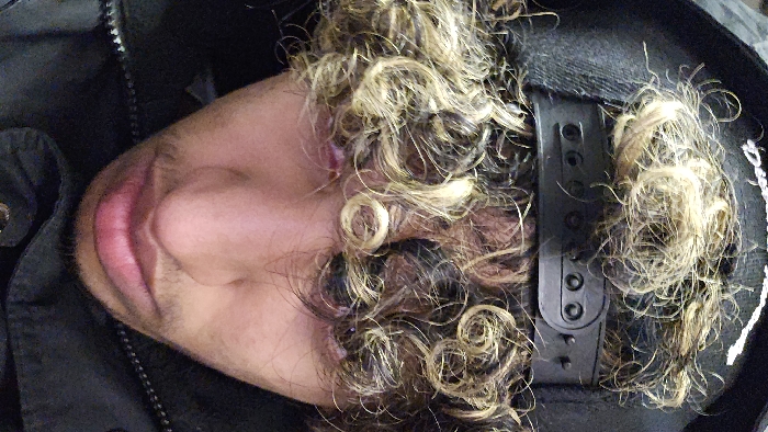 A person's face and curly hair are prominently displayed. The individual's lips are notably pink. Light brown and blonde highlights accentuate the hair, some of which is also black. A black cap with an adjustable plastic strap is visible, obscuring some of the hair. The person is wearing a black jacket. The image is slightly tilted.