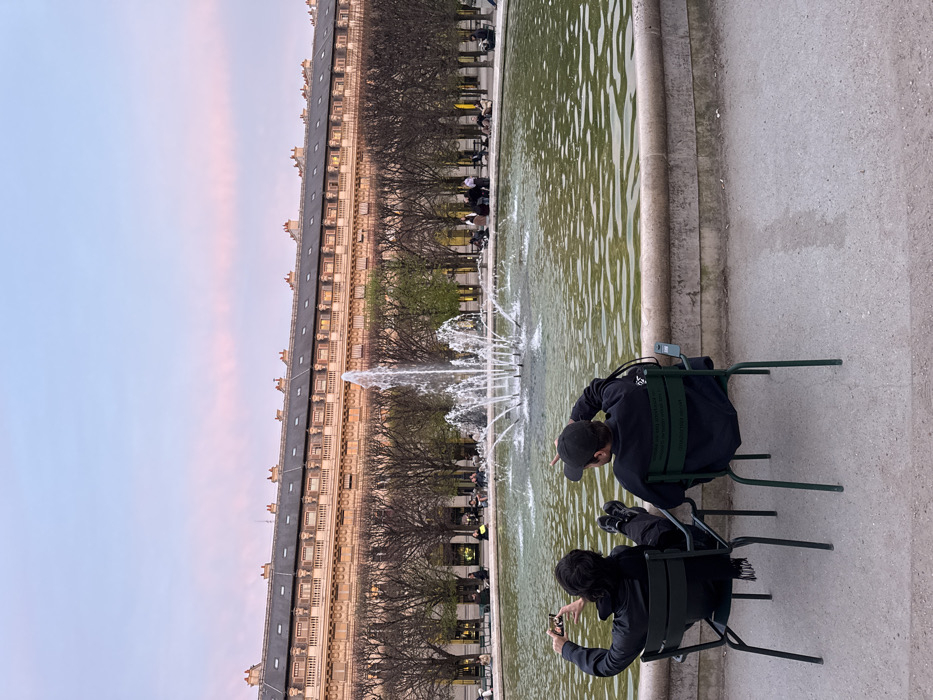 The image depicts a scene within the Jardin du Palais-Royal in Paris, France. In the foreground, two individuals are seated from behind on dark green metal chairs, facing a large circular water basin. The person on the left, wearing dark clothing and a dark scarf, holds a smartphone horizontally, appearing to photograph or video the scene. The individual on the right, wearing a dark baseball cap backward and a dark shirt, has their right arm raised with an extended index finger, pointing towards the fountain. A small, light-colored object is clipped to the side of their chair. The midground is dominated by a circular water basin with murky green water, featuring a multi-jet fountain actively spraying water upwards from its center. A light-colored stone coping forms the edge of the basin. Beyond the basin, a paved area gives way to rows of deciduous trees, many of which are bare or sparsely leafed, with some greener foliage on the right side. Numerous other people are visible scattered around the basin's perimeter and among the trees, mostly seated on similar green chairs. The background is defined by the long, multi-story classical facade of the Palais-Royal building, featuring uniform windows, balustrades, sculptures, and a dark mansard roof punctuated by numerous dormer windows and chimneys. The sky above is a gradient from light blue at the top to soft pink and purple hues near the horizon, suggesting either dusk or dawn.