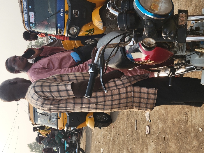 An outdoor scene in Sabojibi, Nigeria, depicts a public thoroughfare or transport hub under daylight conditions. The unpaved ground consists of dirt and scattered debris. In the immediate foreground, the front-right portion of a motorcycle is visible, featuring a red and black fuel tank, chrome handlebars, and a circular headlight with a blue rim. Two adult males are central to the mid-ground. To the left, an individual with a dark, shaved head wears a light brown and dark plaid short-sleeved tunic over dark trousers, standing with his back mostly towards the viewer. To his right, an adult male with short dark hair wears a pink long-sleeved shirt and dark trousers. He is holding a black smartphone to his right ear, engaged in a conversation, and has a light blue object tucked into his left waistband. Behind these individuals, two yellow auto-rickshaws (tricycles) are present. The one to the left has a black canopy and a sticker with "BABA SHUKA" on its front. The one to the right is partially obscured. In the background, additional indistinct figures and vehicles, including another motorcycle ridden by an individual wearing a cap, are visible. Overhead wires are discernible against a hazy sky.