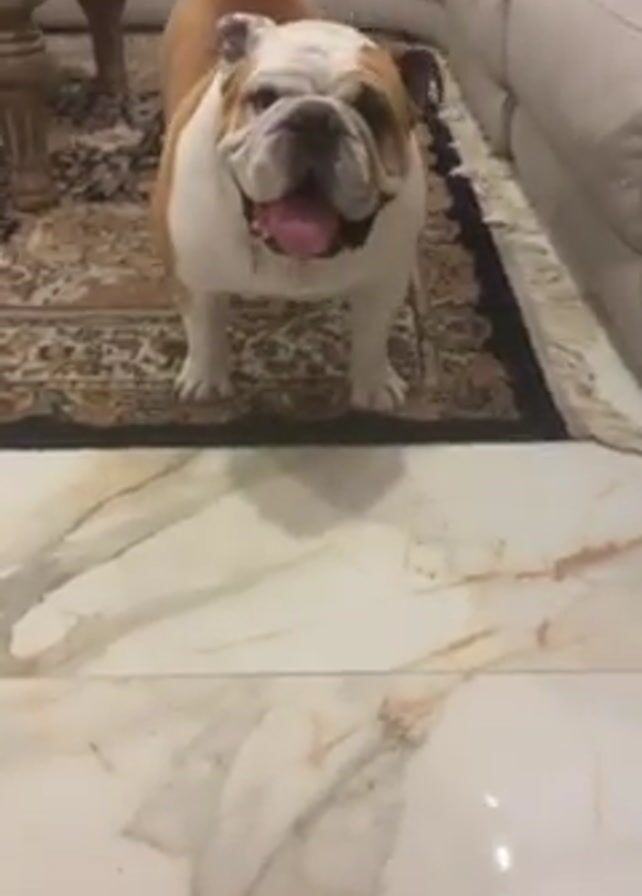 A tan and white bulldog is standing on an ornate rug in a large living room. The dog's tongue is lolling out and it appears to be panting. A hand extends into the frame and the dog moves towards it. The living room is decorated in neutral tones with a large sofa and marble flooring.