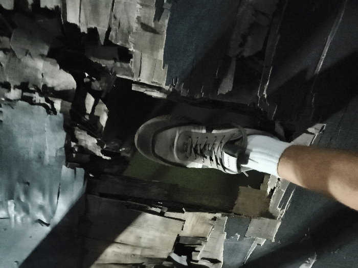 - "The image presents a close-up, first-person perspective of a right lower leg and foot positioned above a severely damaged floor or surface in Baan Chaweng, Thailand" by FM-H4hzl2, licensed under CC BY 4.0