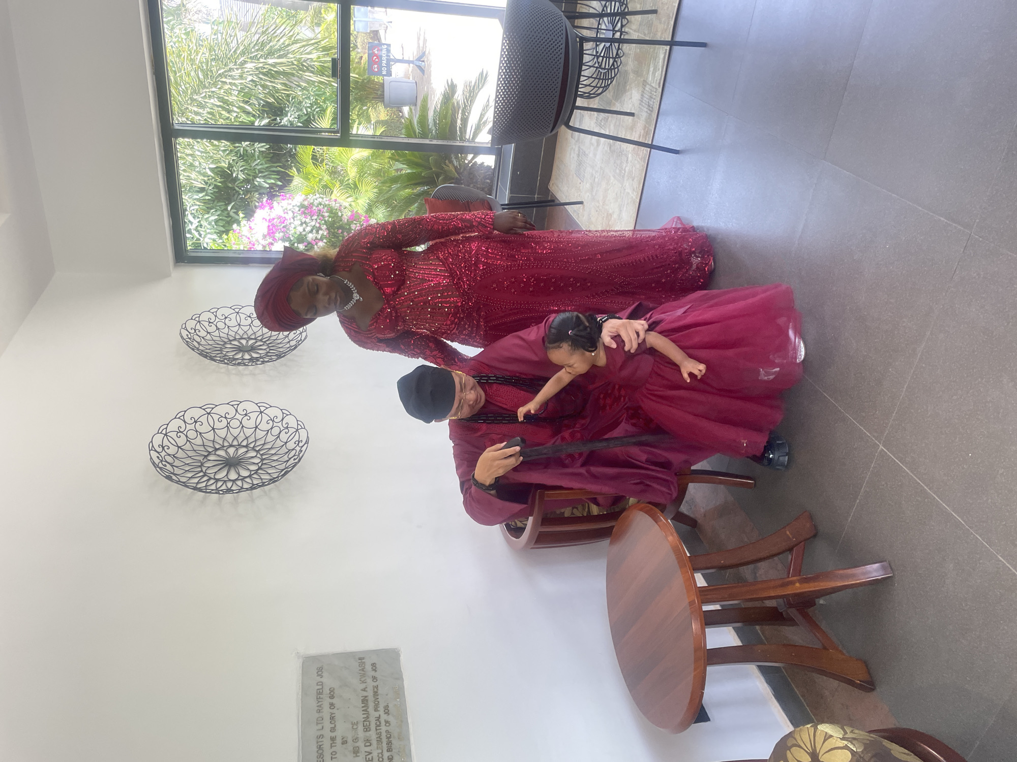The scene depicts three individuals inside Rayfield Resorts Ltd, Gura Top, Jos, Nigeria. On the left, an adult male, wearing a dark red traditional robe, a black cap, and glasses, is seated in a wooden armchair, holding a dark cane. A young child in a matching dark red dress stands before him, reaching a hand towards his cane. To their right, an adult female stands, dressed in a floor-length, sequined dark red gown with a matching headwrap and a silver-toned necklace. The interior features white walls, a dark tiled floor, and large windows revealing a lush outdoor garden with tropical plants, pink flowering bushes, and a distant "NO PARKING" sign. Two dark, circular, decorative metal ornaments are mounted on the white wall. A light-colored plaque on the left wall reads "RAYFIELD RESORTS LTD JOS" and references "HIS GRACE REV. DR. BENJAMIN A. KWASHI, ARCHBISHOP ECCLESIASTICAL PROVINCE OF JOS AND BISHOP OF JOS." A round wooden side table and a modern grey woven chair are also present in the indoor space.
