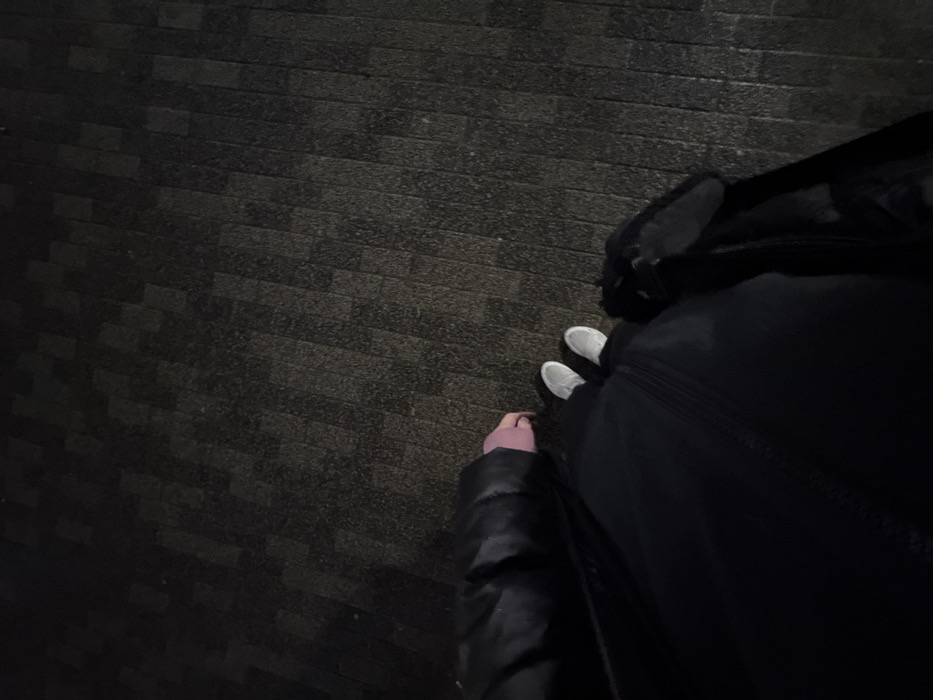 A downward shot reveals a person standing on a dark, patterned brick or tile surface. They are wearing white sneakers and dark clothing, including a puffy jacket or coat. A black bag or backpack is partially visible to the right. The lighting is dim, creating strong contrasts between light and shadow on the ground. The view suggests a first-person perspective, looking down at one's own feet.
