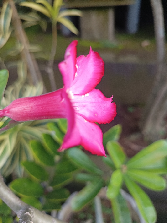 A vibrant pink desert rose flower is in sharp focus, displaying its delicate petals with a slightly ruffled edge. The flower is framed by green leaves, with some leaves being variegated in green and yellow. A gray stem is visible at the bottom left. The background is softly blurred, showing a glimpse of greenery and a neutral-toned structure.