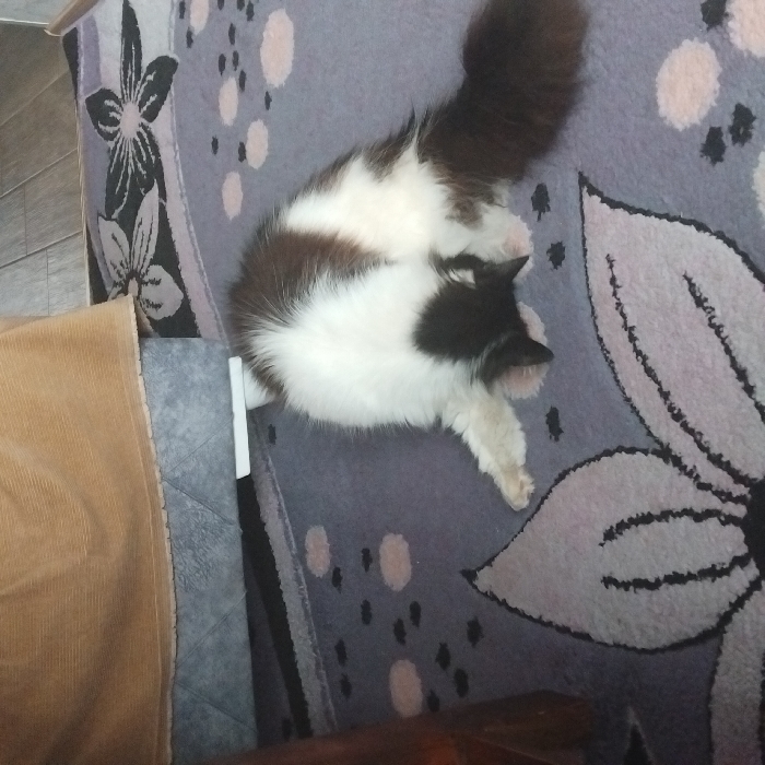 The scene is an indoor environment in Levski, Bulgaria. A domestic bicolored long-haired cat, predominantly white with distinct black patches, is positioned on a patterned rug. The cat's head is oriented downwards, obscured between its front paws, and its body exhibits a slight rotational twist, with its black tail extending towards the right side of the frame. The rug is purple-grey, featuring large light-colored floral motifs with black outlines and scattered smaller light pink and black abstract shapes. The upper section of the image displays the lower part of a piece of furniture, which consists of a beige corduroy-textured fabric skirt covering a grey, geometrically patterned base. A light-colored wooden floor is visible in the background, behind the rug and furniture.
