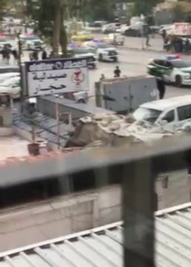 street scene with several police vehicles present. There are at least seven white SUVs with blue and red flashing lights, suggesting some kind of emergency or security situation. Several people are seen walking around and near the vehicles. The setting appears to be a street in a city, with buildings visible in the background and parked cars on the side of the road. A sign in Arabic is also visible. There is some debris on the rooftop area in the foreground. The footage appears to be shot from an elevated position, possibly from a building.