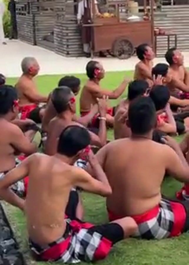 group of Balinese men performing a Kecak dance on a lawn