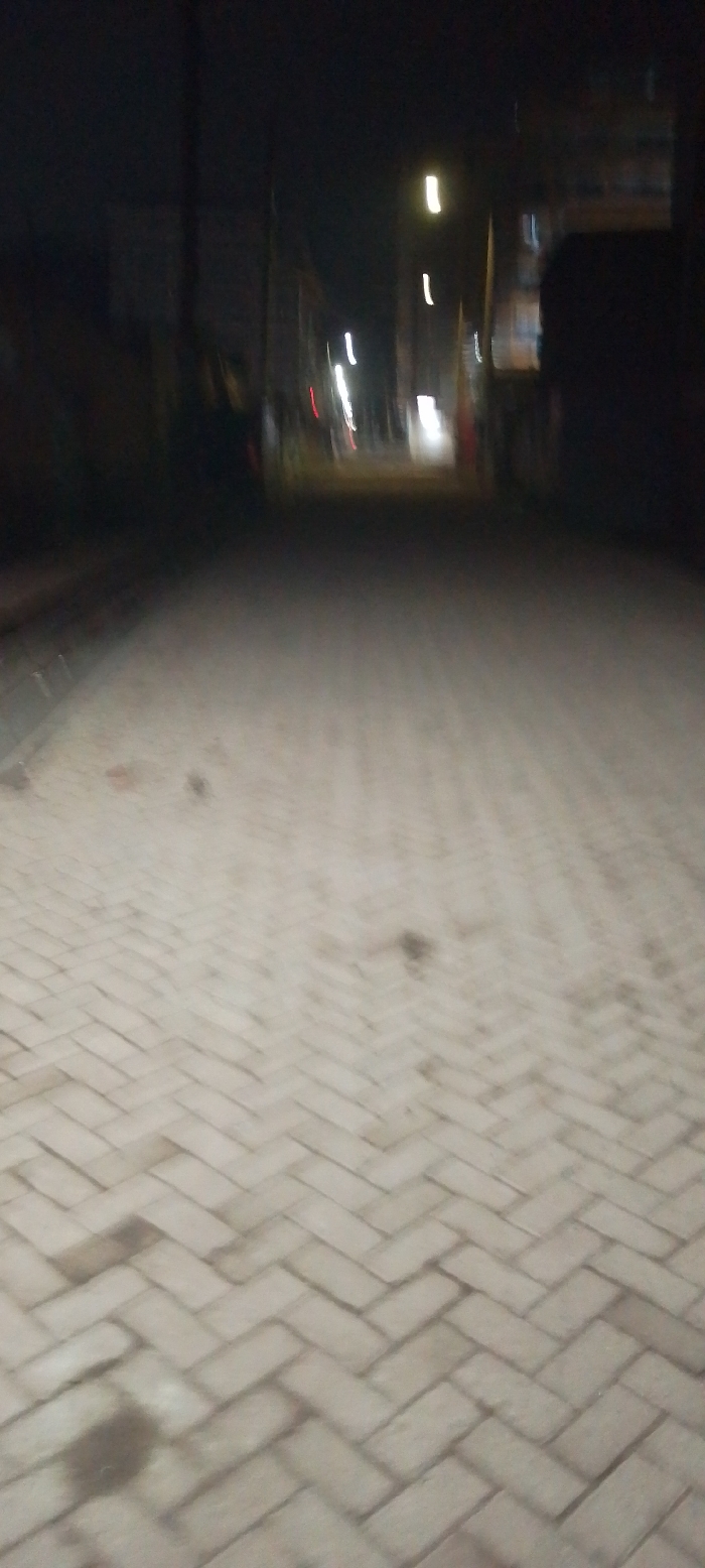 The image depicts a nighttime street scene in Nairobi, Kenya. The foreground is dominated by a light-colored paved surface, constructed from rectangular blocks laid in a herringbone pattern, showing some minor dark stains. A darker, narrow edge or curb runs along the left side of the paving. The paved area recedes into the distance, appearing narrower as it extends. In the mid-to-far distance, multiple artificial light sources are visible, appearing as blurred vertical streaks of white, yellow, and a single red light, illuminating the distant path. Dark, indistinct shapes suggestive of buildings or structures flank the paved area on both sides. A large, dark, vertical mass occupies the right side of the frame in the midground. No discernible individuals, vehicles, or specific objects are clearly present, nor are any actions or interactions visible. The overall environment is dark and appears urban or semi-urban.