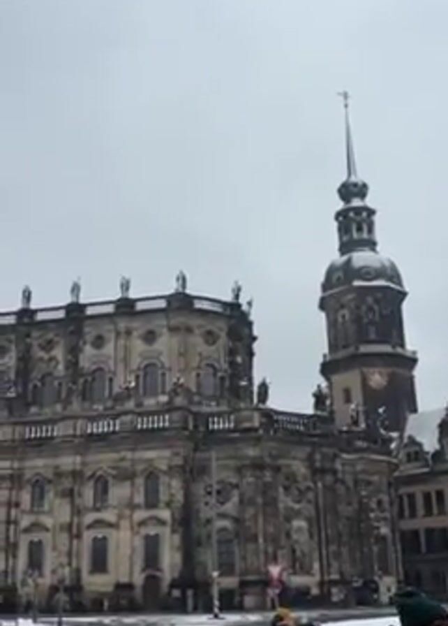 large, ornate, baroque-style building in Dresden, Germany, covered in a light dusting of snow