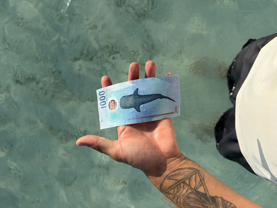 A close-up, first-person view depicts a person holding a Maldivian 1000 Rufiyaa banknote over clear, shallow, turquoise water in Guraidhoo, Maldives. The person's right forearm, featuring a tattoo of a stylized marine shell, and their hand are visible, holding the blue banknote horizontally. Water droplets are present on the hand and banknote. The banknote prominently displays a whale shark illustration in its center, with the "1000" denomination visible. The person's lower torso, clad in dark shorts over a light-colored garment, is visible below the hand. The underlying sandy bottom and the person's feet are faintly visible through the rippling, sunlit water.