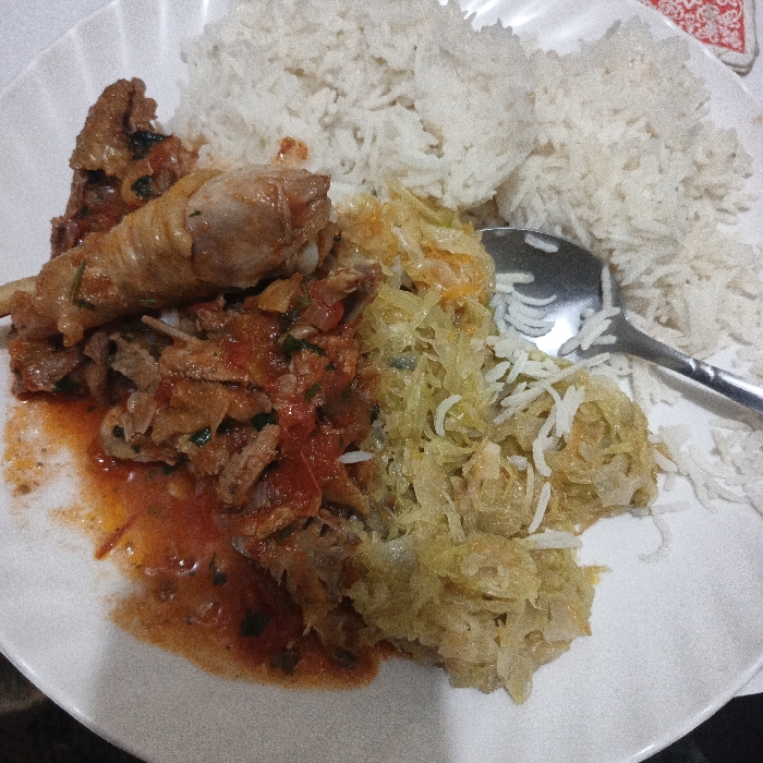 A white oval plate holds a meal comprising three distinct components. Approximately half of the plate is covered with a mound of plain white, long-grain rice. To the left, a portion of stewed meat in a thick, reddish-orange tomato-based sauce contains visible pieces of diced tomatoes and green herbs; a prominent cooked chicken drumstick or similar bone-in piece of poultry is identifiable within this stew. Adjacent to the stew and rice, a serving of light green to yellowish shredded cabbage is present. A silver-colored metal spoon with an oval bowl rests on the rice and cabbage. The background is out of focus, revealing a blurred red and white patterned object in the upper right quadrant. The specific location within Nairobi, Kenya, cannot be determined from the visual information provided in the image.