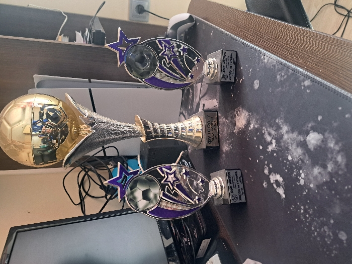 The image depicts an indoor environment, specifically a desk displaying three sports trophies