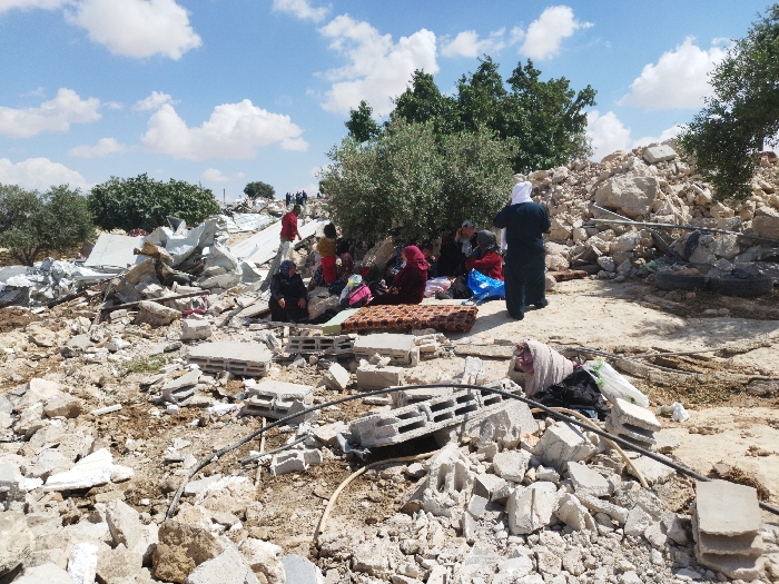 A group of people, mostly women and children, are sitting among the rubble of a demolished building in Khallet ad-Daba'a, Unknown