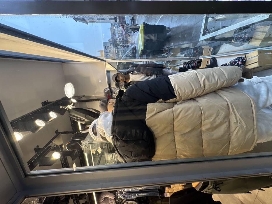 The image depicts a retail store window display in Strasbourg, France, observed from the exterior. The primary subject is a mannequin, positioned with its back to the viewer, wearing a black and beige two-tone puffer jacket, a light grey hooded sweatshirt, a white baseball cap, and white cargo pants. To its right, partially obscured, is another mannequin wearing a black baseball cap and a dark patterned face covering. Further to the right, a third mannequin faces outwards, dressed in a black leather jacket, a grey t-shirt, light blue jeans, and a black baseball cap. The store's interior is illuminated by several overhead track lights, revealing racks of clothing (jeans, jackets) and backpacks. Shoes are displayed on wooden crates near the bottom of the window. Reflected in the store window is an exterior street scene in Strasbourg. The street surface appears wet, indicating recent rain. A large, black wheeled dumpster with a yellow lid is centrally reflected. Vehicles, including a grey SUV and a white van, are visible on the wet street. Across the street, a building features a visible "DLS TELECOM" sign. The sky is overcast, and architectural elements typical of European cities, including a distant pointed roofline or spire, are discernable in the reflection. No clear human figures are actively engaged in the exterior scene.