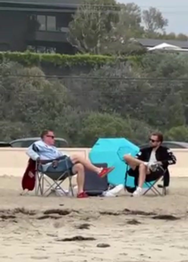Two men sit in folding chairs on a sandy beach under an overcast sky. They wear sunglasses and face each other, appearing to be engaged in conversation. The man on the left is dressed in a light-colored shirt, dark shorts, and red shoes, with a red jacket hanging on his chair. The man on the right is wearing a black jacket with white accents, dark shorts, and white shoes. A closed blue umbrella stands between them, and there is a suitcase on the ground. In the background, there is a building on a slight rise, separated from the beach by a line of trees. Cars are visible in the background as well.