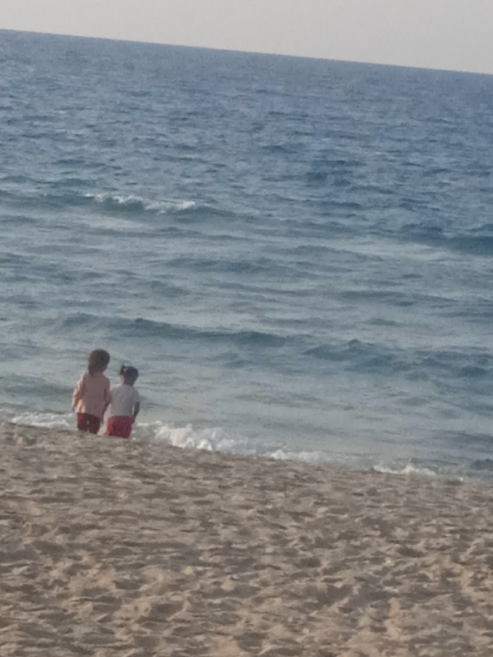 The image depicts a coastal scene in Khan Yunis, Unknown. Two individuals, identifiable as young children, are positioned at the water's edge of a sandy beach, facing away from the camera and towards the sea. The child on the left wears a light-colored top and dark red shorts, with their lower legs submerged in the shallow water. The child on the right wears a light-colored top and red shorts, also with their lower legs in the water, where small waves are breaking. The foreground consists of light brown sand, transitioning to blue-grey ocean water that extends to a visible horizon under a light-colored sky. The sea exhibits ripples and small wave formations.