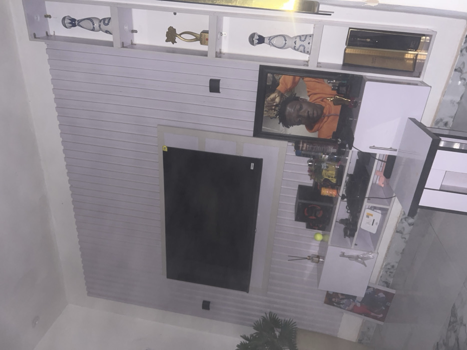 A modern living room features a wall-mounted flat screen TV. Above the TV, built-in shelves display decorative bottles, a trophy, and a framed portrait of a person. To the right of the TV, a white cabinet showcases electronics and various items. Below, a plant adds a touch of nature. The wall paneling behind the TV has a textured, horizontal striped pattern. The overall design is clean, minimalist, and contemporary.