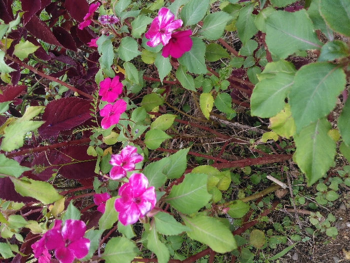 This image displays a dense cluster of various plant life within the city of Nathene, Laos. The scene is dominated by flowering plants featuring multiple five-petaled blooms, primarily in shades of magenta and fuchsia pink. Several of these flowers exhibit distinct white variegation emanating from their centers, while others are solid pink. These flowering plants have oval, pointed leaves of varying shades of light to medium green, and reddish-brown stems. Interspersed among these are plants characterized by broad, dark red or burgundy leaves, creating a contrasting backdrop. The lower portion of the image reveals the ground layer, which consists of visible soil mixed with sparse green ground cover and scattered dry plant debris, including thin twigs and dried leaves. No human subjects, animals, or specific actions are depicted. The environment appears to be an outdoor, natural setting, under diffused natural light.