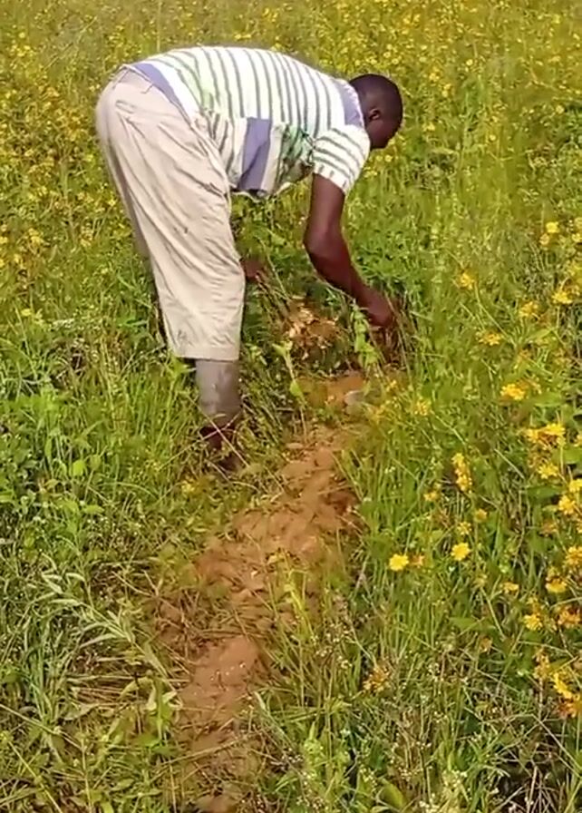 A man in a striped shirt and pants is using a hoe to dig in a field of yellow wildflowers. He then pulls up a bundle of plants with what appears to be peanuts attached to the roots. He looks at the camera and holds one peanut up, then walks away.