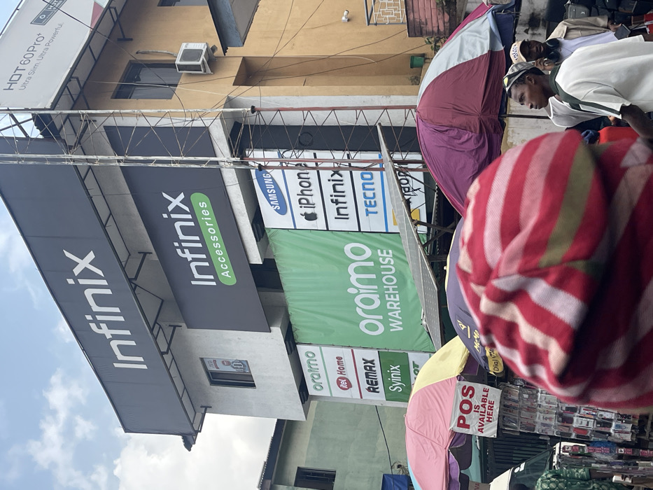 The image depicts a bustling commercial street scene in Ikeja, Nigeria. A multi-story building dominates the background, featuring prominent black and gray signage for "Infinix" at its upper levels, with additional banners for "Infinix Accessories." Below these, a large green banner advertises "oraimo WAREHOUSE." To the left of the Oraimo banner, a vertical stack of smaller white signs displays brand names including "oraimo," "itel Home," "Remax," and "SyiNix." To the right, another vertical stack of signs lists "SAMSUNG," "iPhone," "Infinix," and "Tecno." An additional white banner at the top right promotes "HOT 60Pro+." The building exhibits a light-colored facade on the left and a yellow-ochre section on the right, which includes an external air conditioning unit. A metal lattice tower stands adjacent to the building signs. In the foreground, a street market is active, characterized by multiple open vendor umbrellas in various colors (pink/yellow, purple/white, and red/white) providing shade. A white sign with red text "POS IS AVAILABLE HERE" is visible beneath a pink and yellow umbrella. Solar panels are installed on a frame below the building's main signage. Several individuals are present: the back of a person's head, wearing a red and white striped head covering, is prominently featured in the immediate foreground. To the right, a young man in a white and dark green shirt and a baseball cap looks towards the left side of the frame. Behind him, another male figure with headphones around his neck is partially visible. A person in green patterned attire is partially obscured on the far left. The sky is overcast.