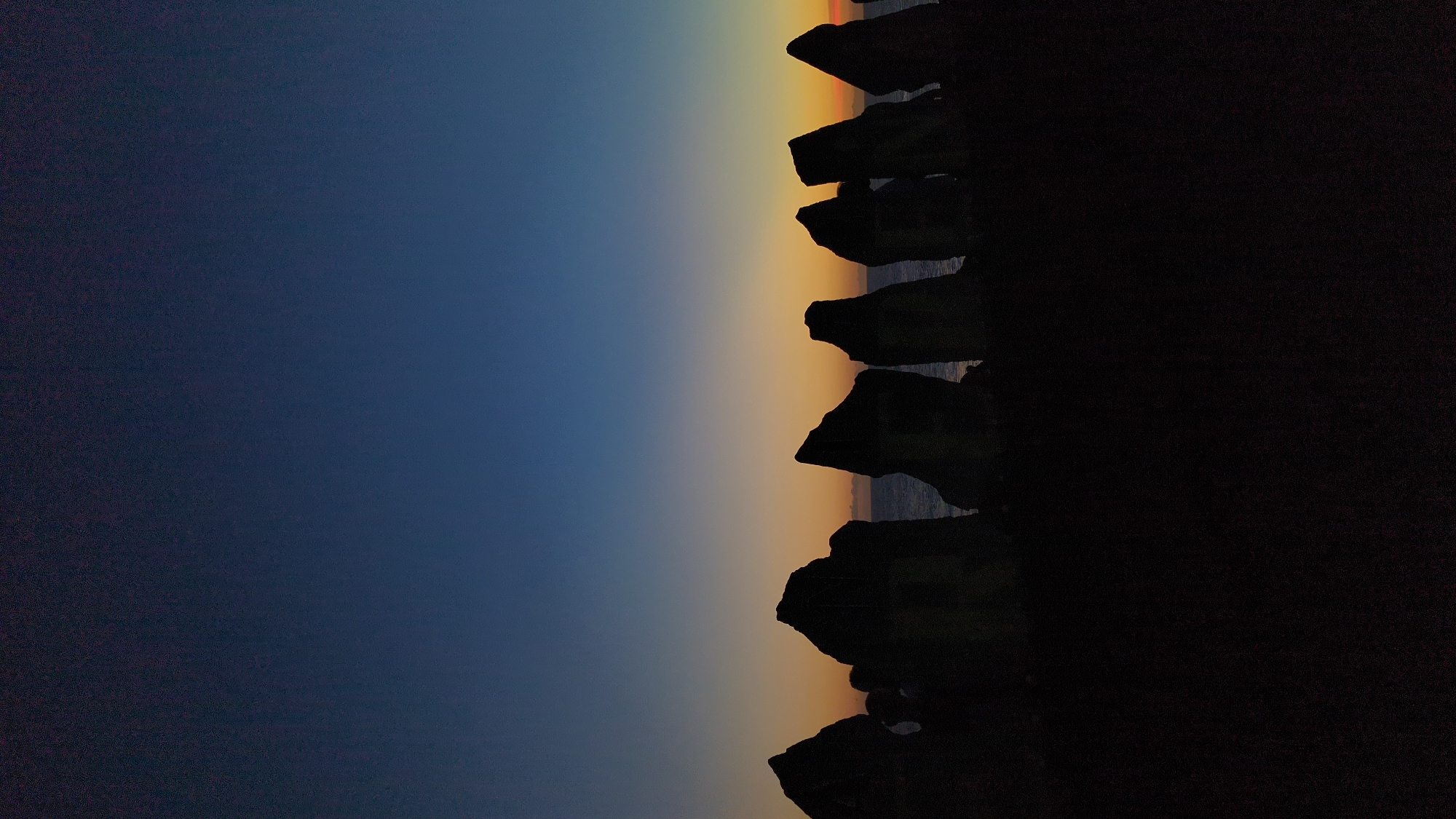 twilight scene in Pererenan, Indonesia, along the coastline. The sky transitions from dark blue to orange towards the horizon. Silhouetted rock formations are visible along the coastline, separating the sky from the dark foreground. The ocean is hinted at between the rocks. The photo appears to be taken at dusk or dawn.