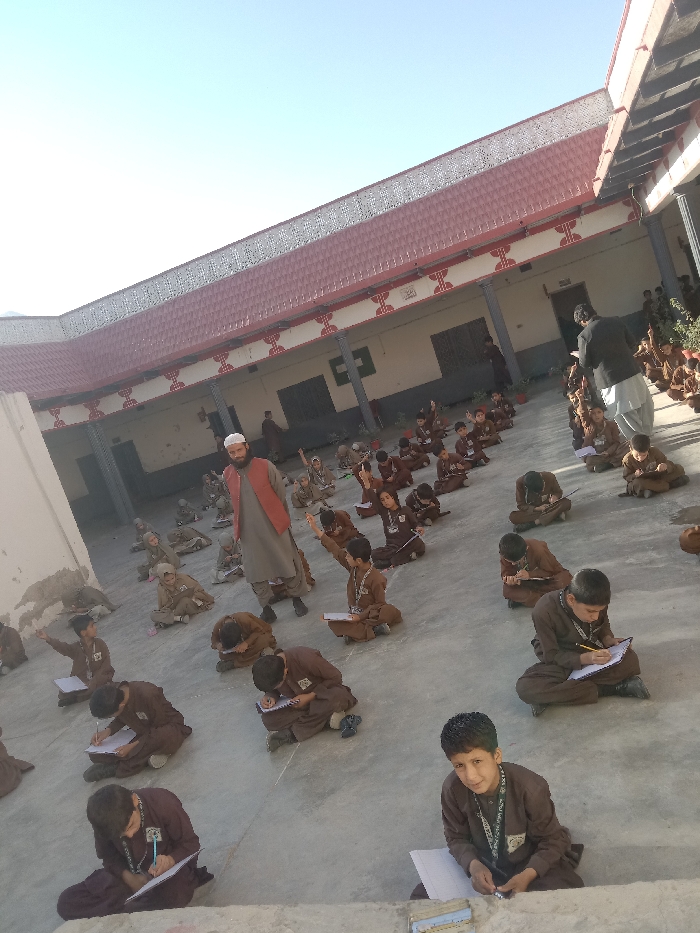 This image depicts an outdoor educational scene within a concrete courtyard in Quetta City Tehsil, Pakistan