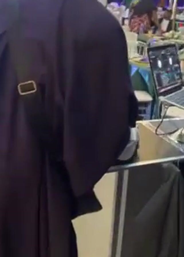 two thick stacks of cash on a table. The table is next to a DJ booth. There are chairs and tables in the background with people seated at them. A person in a purple robe is standing nearby.