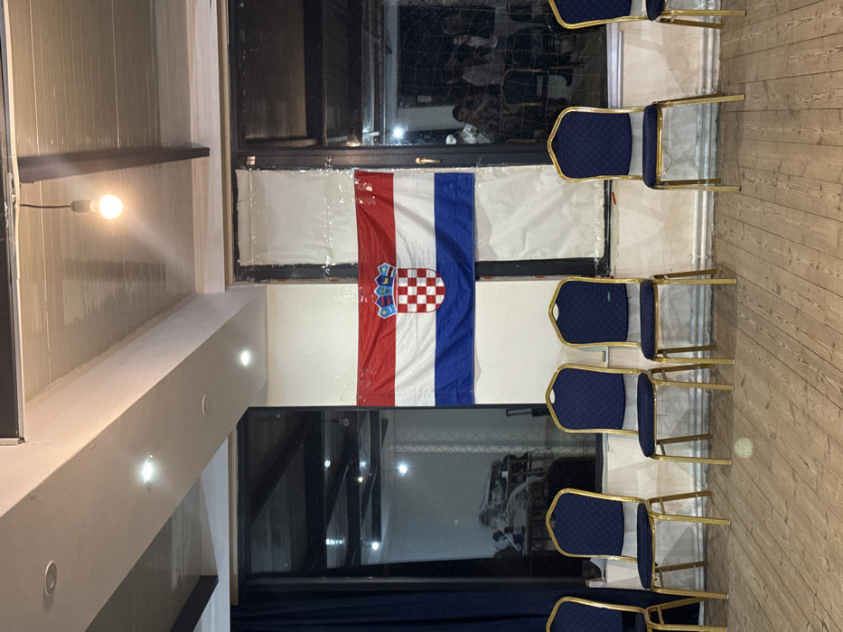 This image captures an indoor venue in Bakuriani, Georgia. The foreground features a row of five identical, unoccupied banquet chairs, each with a gold-colored metal frame and dark blue patterned fabric upholstery, resting on a light brown wooden floor composed of planks. In the background, a Croatian national flag is horizontally displayed on a light-colored wall, centered between two large window panels. The flag features red, white, and blue horizontal stripes with the national coat of arms in the center. The section of the wall and window frame directly to the right of the flag is covered with a translucent white protective material. Through the rightmost window panel, several blurred human figures are visible in an adjacent room, appearing to be seated at tables. The ceiling overhead includes multiple recessed spotlights and a single exposed incandescent light bulb hanging from a black cord. A dark blue curtain is partially visible on the far left.