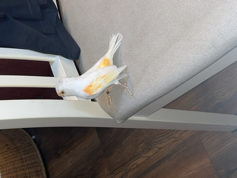 The scene is located indoors in the city of Torrent, Spain. A single bird, predominantly white with orange-yellow patches on its wings and a slight yellow hue on its crown and face, is perched facing left on a light grey, tightly woven upholstered chair seat. Its pinkish-brown legs and visible claws grip the fabric. The chair features a white frame, with vertical and horizontal struts of its backrest partially visible behind the bird. To the left, a dark brown wooden floor with distinct grain patterns is visible, alongside a portion of a light brown woven wicker basket in the upper-left corner. To the right, a dark, reddish surface is visible behind the chair, partially obscured by a dark black fabric item draped over the top of the chair's backrest. The area is illuminated by internal ambient light.