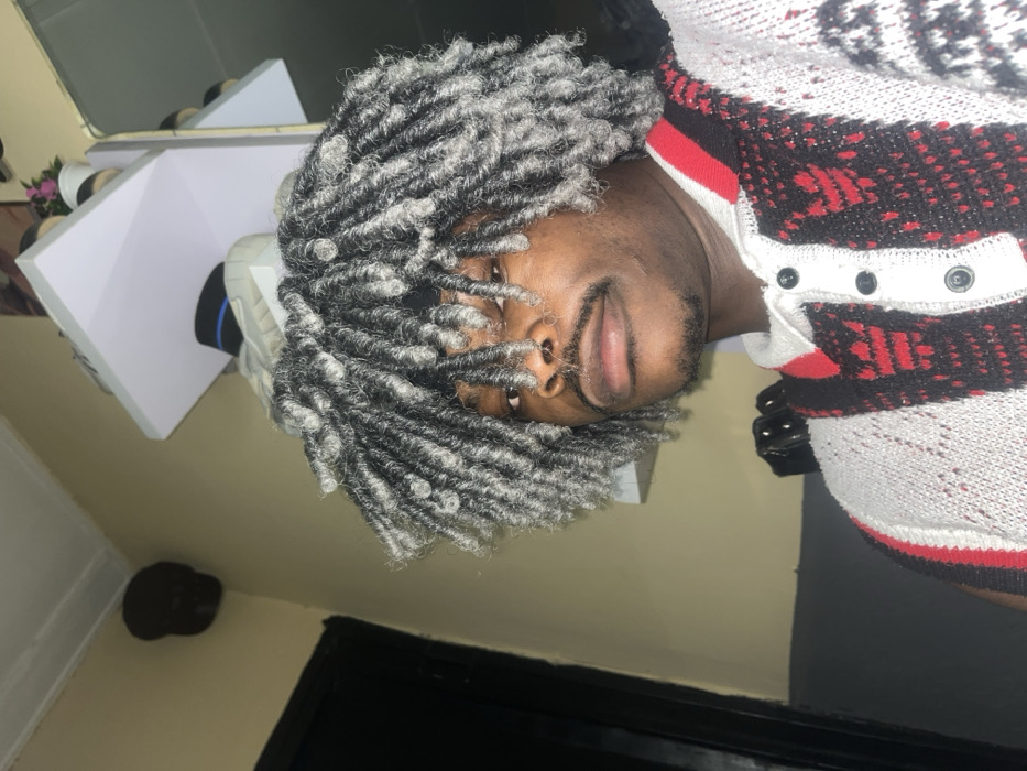 A dark-skinned individual with gray, loc'd hair fills the frame. The person is wearing a sweater with a red, black, and white pattern and buttons visible on the chest. The head is tilted to the side, and part of the face is visible. A white structure sits behind the person, and a dark object appears in the bottom left corner. A dark area also is in the lower part of the image.