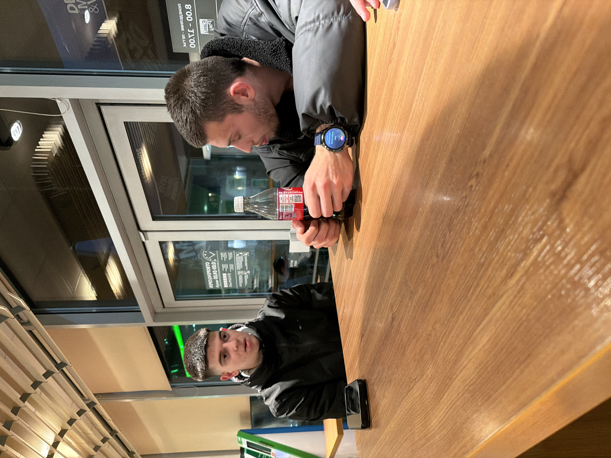 An interior scene in Smolyan, Bulgaria, depicts two young males seated at a polished wooden table. The male on the left wears a black hooded jacket and sits facing forward, with his gaze directed towards the male on the right. A black smartphone rests face-up on the table to his left. The male on the right, wearing a black puffer jacket with a textured collar, is turned slightly left, looking towards the first male. He holds a red-labeled Coca-Cola plastic bottle with both hands, and a dark blue smartwatch with an active display is visible on his left wrist. The background features large glass windows reflecting interior lighting and an exterior nighttime street scene with blurred lights. Overhead, the ceiling displays parallel wooden slats with integrated illumination. In the far left background, a green and white angled display stand is visible. Inverted Bulgarian text visible in the window reflection identifies the city as Smolyan.