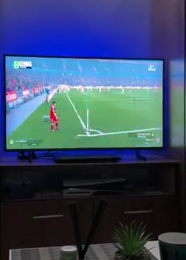 person watching a soccer video game on a large flatscreen TV. The game is between Real Madrid and FC Bayern Munich. The TV is on a dark brown media console. There are decorative items on the coffee table in front of the console. Blue LED strip lighting is behind the TV.