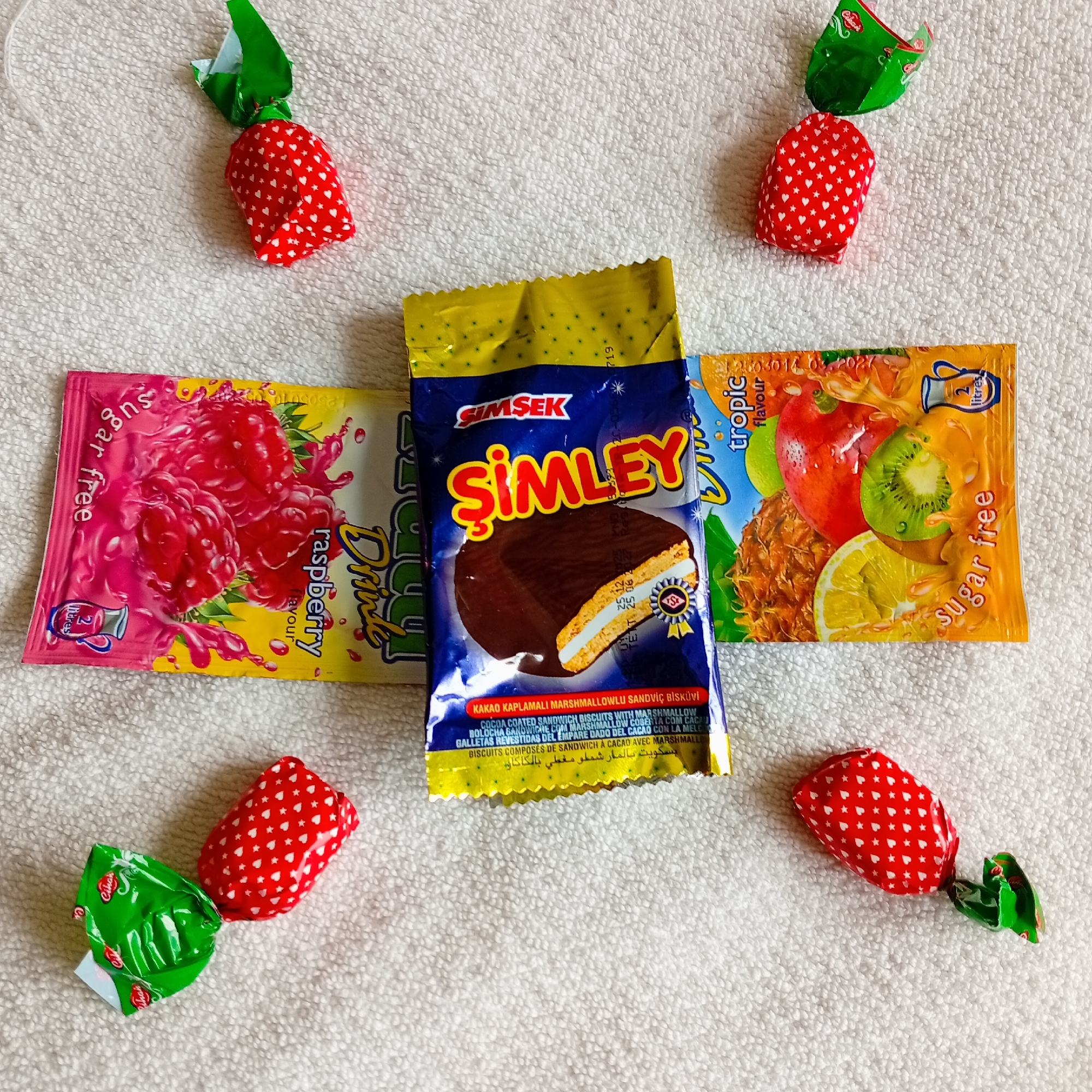 The scene in Harmanli, Bulgaria, depicts a collection of pre-packaged confectionery and drink mixes arranged on a white, textured fabric surface, likely a towel. Four individual strawberry-shaped candies, wrapped in red foil with white heart patterns and twisted green ends, are present. Two of these candies are positioned in the upper half of the frame, and two in the lower half. Centrally, a vertical blue and yellow packet of "ŞİMŞEK ŞİMLEY" cocoa-coated marshmallow sandwich biscuits is displayed, featuring an image of the biscuit and multilingual text. To the immediate left of this central packet lies a horizontal pink and yellow packet for "sugar free raspberry flavour" drink mix, illustrating raspberries and a pitcher signifying a 2-liter yield. To the immediate right of the central biscuit packet is a horizontal orange and yellow packet for "sugar free tropic flavour" drink mix, depicting pineapple, apple, kiwi, and lemon, also indicating a 2-liter yield. All packaging appears sealed and undisturbed. No individuals are present, and no actions or interactions are depicted beyond the static arrangement of the items.