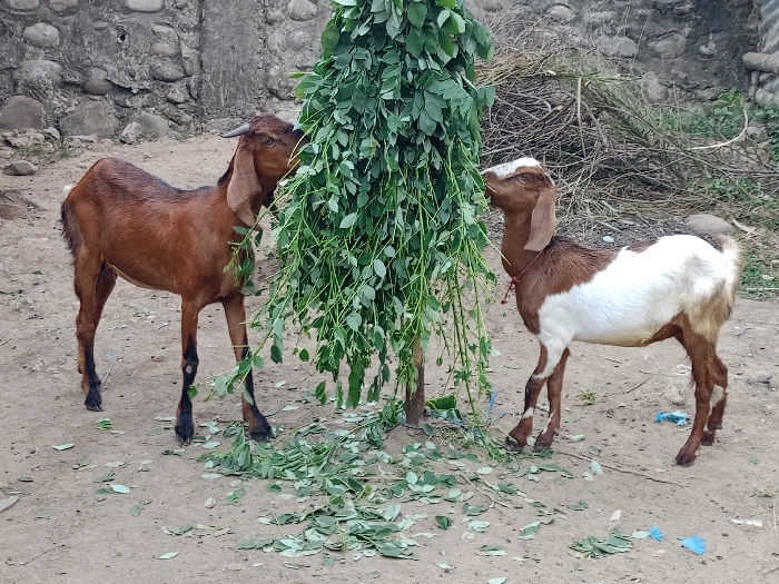 - "Two domestic goats are positioned on dry, light brown dirt, actively consuming leaves from a central, upright bundle of green foliage" by FM-v8vYF3, licensed under CC BY 4.0