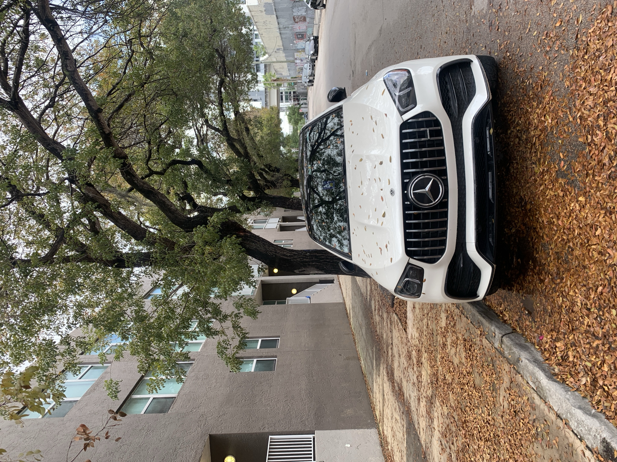 The scene depicts a white Mercedes-Benz SUV parked on a tree-lined street
