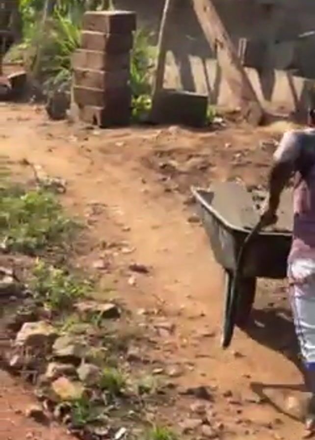 three men in a rural setting who appear to be constructing a building. One man is pushing a wheelbarrow filled with material along a dirt path. Another man is walking alongside the wheelbarrow. A third man is standing on a scaffolding, working on the brick structure. Stacks of bricks are visible near the scaffolding. The area is surrounded by lush greenery, including banana trees and other vegetation. There is a building with a tin roof in the background.