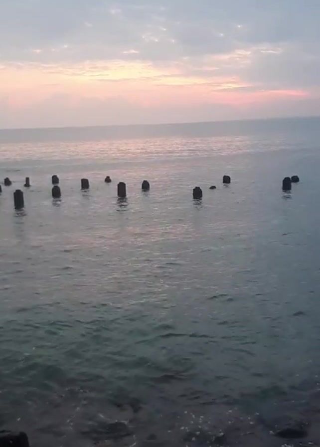 calm ocean at dawn or dusk. The sky is overcast with shades of gray and hints of pink and orange on the horizon, indicating either sunrise or sunset. Several dark, weathered pilings stand in the water, arranged in a scattered line away from the shore. The water is a dark teal color with gentle ripples and small waves. The shoreline is rocky, with a few visible dark rocks at the bottom of the frame. The camera is stationary, offering a wide, static shot of the scene. There is no human activity visible.