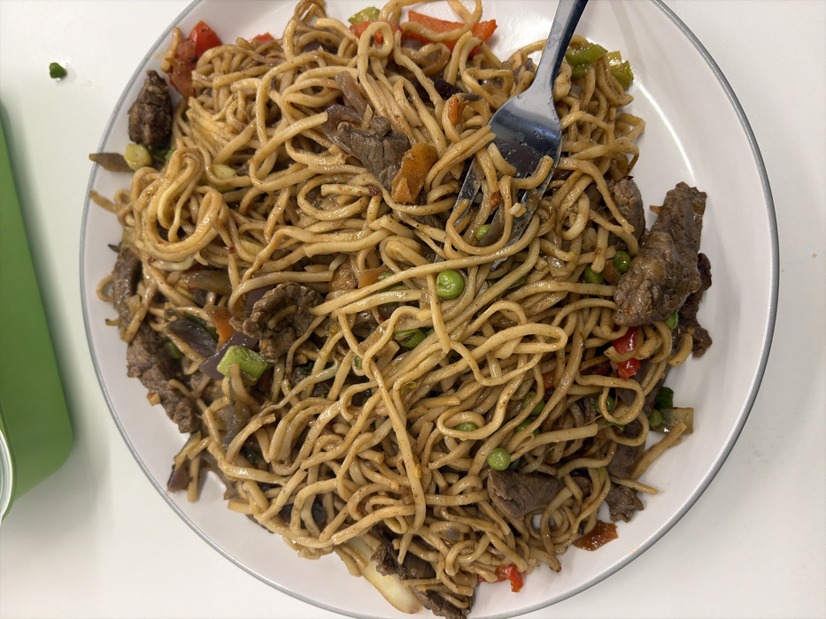 - "A white round ceramic plate with a thin grey rim contains a serving of stir-fried noodles, beef, and vegetables" by FM-csusO2, licensed under CC BY 4.0