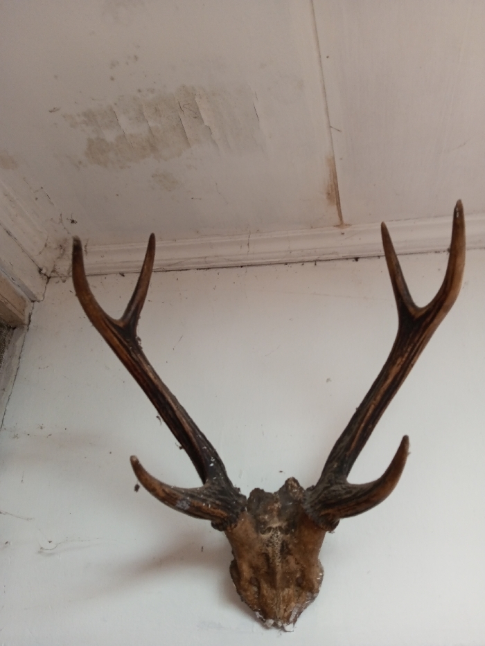 Mounted deer antlers are prominently displayed against a white wall. The skull and antlers have a weathered appearance, exhibiting various shades of brown. Above, the ceiling shows signs of aging with peeling paint and water damage. The scene evokes a rustic, potentially aged interior setting.