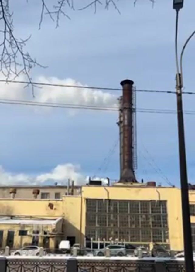 large, yellow industrial building with a tall, rusted chimney. The chimney is emitting smoke, and there is a ladder running up the side of the chimney. The building has many large windows, and there are several cars parked in front of it. There is a decorative fence in the foreground, and snow on the ground. A bare tree branch is visible at the top of the frame, partially obscuring the blue sky with white clouds. A street lamp is seen to the right of the frame.