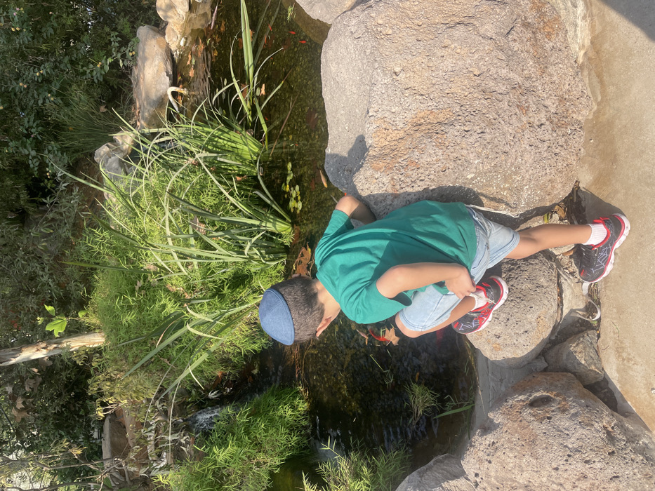 A young boy, viewed from behind, wearing a blue denim kippah, a teal t-shirt, light blue denim shorts, and black and red sneakers with white socks, is observed at a pond in Tel Mond, Israel. He is crouched with his left foot on a concrete path and his right foot on a light-colored rock, leaning forward with his right arm resting on another large rock, looking intently into the water. The pond features clear water, several small orange fish, and floating green aquatic plants. On the left, a small waterfall cascades into the pond, which is bordered by various large, light-colored rocks and dense green vegetation, including tall grass-like plants. The background consists of abundant green foliage and trees under bright daylight conditions.