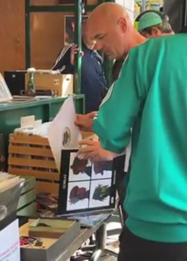 A bald man in a black shirt carefully examines a Gorillaz record at an outdoor vendor stall. He is standing in front of a table laden with various items, including wooden crates filled with records. Another man, wearing a green Adidas track jacket, stands next to him, also looking at the record. In the background, a person wearing an Adidas tracksuit and another with a green cap are visible. The vendor stall is constructed from wood and has several shelves displaying merchandise. The setting seems to be a busy market or fair.