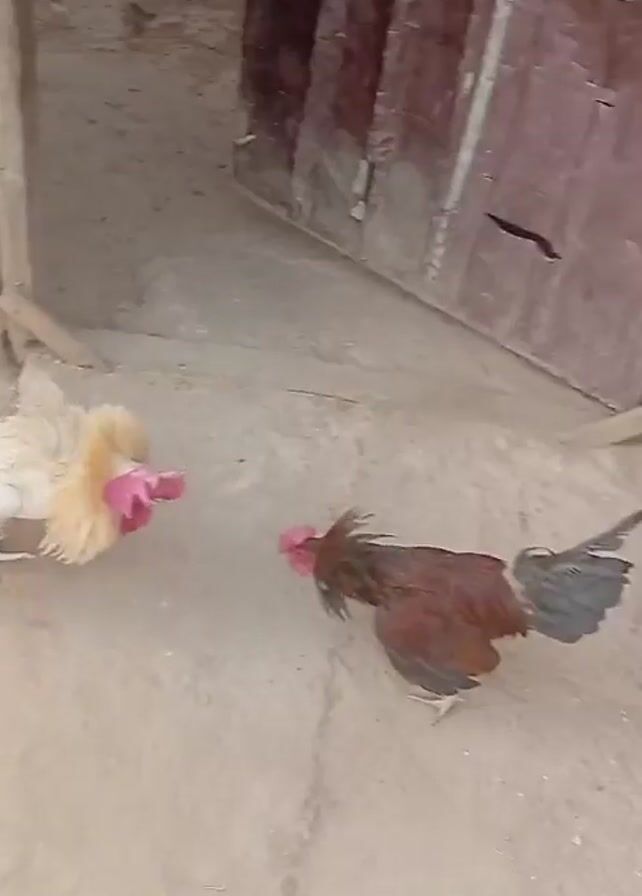 - "Two roosters face each other on a dirt surface next to a building" by FM-5BSlE2, licensed under CC BY 4.0