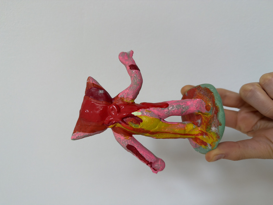The scene depicts a small, abstract, humanoid-like sculpture being held by a human hand, set against a plain, light grey background. The location is Grad Rijeka, Croatia. The sculpture, roughly 15-20 cm in height, appears to be made of a textured, solid material, possibly ceramic or clay. It features a simplified, bulbous body with stubby arms extended outwards and a pointed, somewhat triangular head. The primary colors applied to the sculpture are bright pink with glitter accents, and a vibrant yellow on the torso and lower limbs. A significant amount of glossy, thick red paint has been applied to the head and upper torso, visibly dripping down the front of the figure, creating streaks over the pink and yellow surfaces. The base of the sculpture is rounded and painted in a combination of green, red, and other mixed colors. A Caucasian human hand, positioned in the lower center of the frame, supports the sculpture from beneath its base. The fingers are slightly spread, gripping the circular base. The background is an unadorned, uniform light grey wall or surface, providing a stark contrast to the colorful object. The lighting appears even, without harsh shadows, suggesting an indoor setting with diffused light.