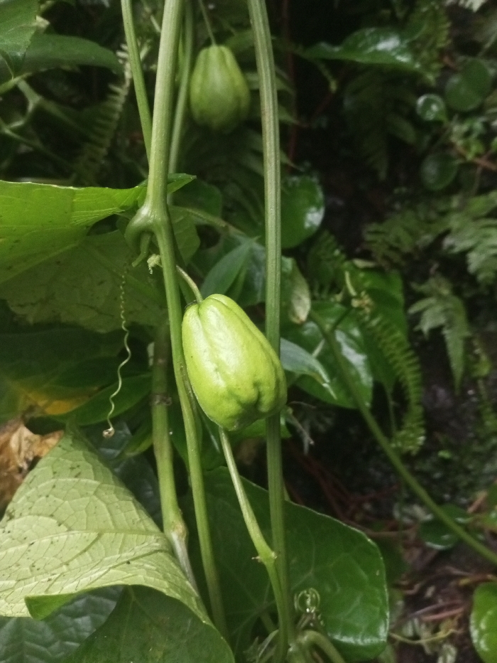 A vertical close-up photograph depicts a dense growth of green foliage and fruit in Ura-Dozhi, Bhutan. Two light green, pear-shaped fruits, consistent with young chayote gourds, are central to the composition. The most prominent fruit, approximately 6 cm in length, hangs in the mid-foreground, exhibiting subtle longitudinal ridges and a smooth texture. A second, smaller, and blurred fruit is visible in the upper background. Multiple slender green plant stems and vines extend vertically through the frame, with one distinct coiled tendril observed to the left of the foreground fruit. Large, broad green leaves with visible venation occupy the lower left and mid-left areas. The background consists of darker, varied green vegetation, including discernible fern fronds and other wet, reflective leaves, indicating a humid natural environment. No human presence or artificial objects are visible.
