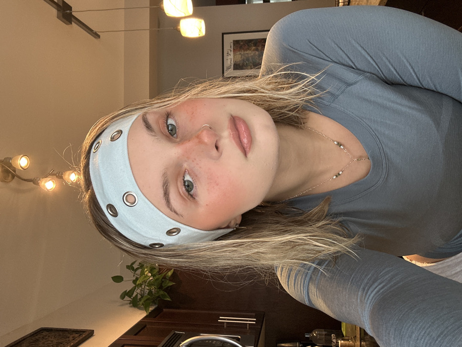 A young woman poses for a selfie. She is fair-skinned with freckles, blonde hair, and a light blue headband with metallic grommets. She wears a long-sleeved, fitted blue top and a delicate silver necklace. Her expression is neutral, with slightly parted lips. The background includes a light fixture, kitchen cabinets, and a potted plant. The image is well-lit with soft lighting.